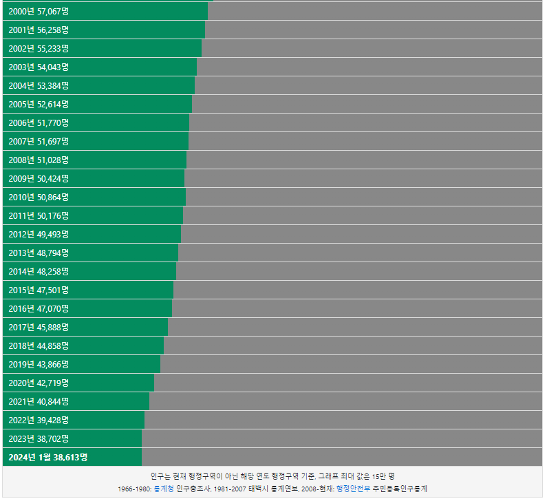태백시 인구는 2000년 5만명 이었습니다. 그리고 2012년 처음으로 5만명 이하로 감소하였고 지속적으로 인구가 감소하고 있습니다. 2024년 현재 3만명이 태백시에 거주하고 있습니다.