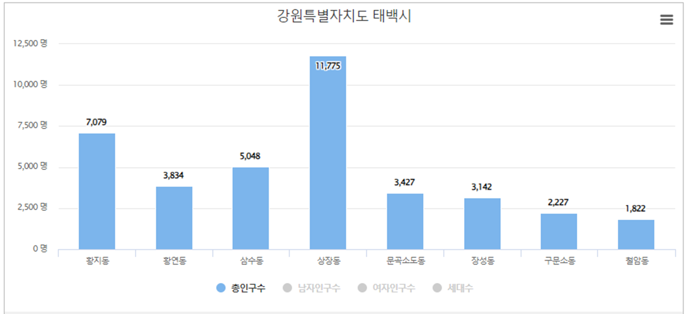 태백시에서 상장동 인구가 가장 많으며 인구는 11,775 명, 세대수는 5,638 입니다. 두번째로는 황지동 인구가 많고 인구 7,079 명, 세대수는 3,484 입니다. 세번째는 삼수동으로 인구는 5,048 명, 세대수는 2,665 입니다.