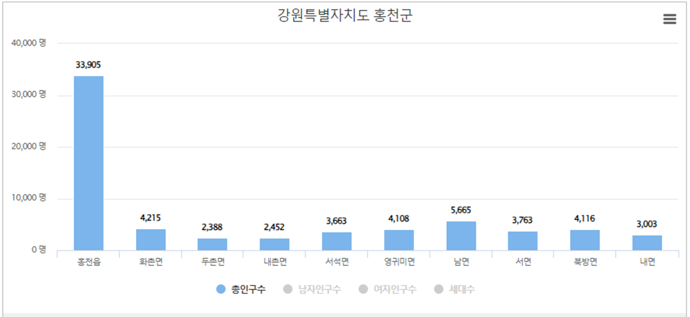 홍천군에서 홍천읍 인구가 가장 많으며 인구는 33,905 명, 세대수는 16,014 입니다. 두번째로는 남면 인구가 많고 인구 5,665 명, 세대수는 3,185 입니다. 세번째는 화촌면으로 인구는 4,215 명, 세대수는 2,452 입니다.