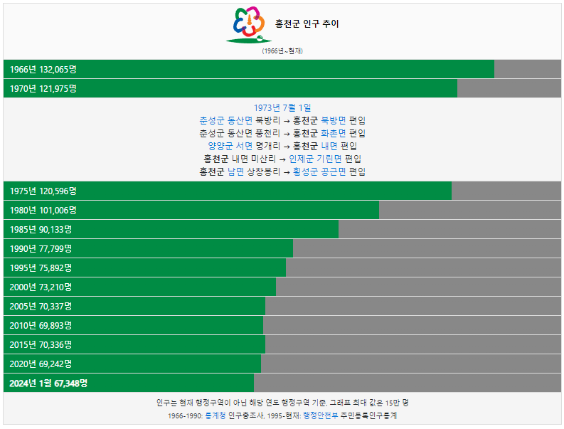 홍천군 인구는 1966년 13만명 이었습니다. 이후 인구가 지속적으로 감소하였고 2000년 이후에는 큰 변동없이 7만명 정도를 유지하고 있습니다. 2024년 현재 6만명이 홍천군에 거주하고 있습니다.