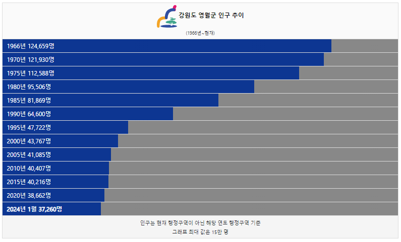 영월군 인구는 1966년 12만명 이었습니다. 그리고 인구가 지속적으로 감소하여 1980년 처음으로 10만명 이하로 감소하였습니다. 2024년 현재 3만명이 영월군에 거주하고 있습니다.