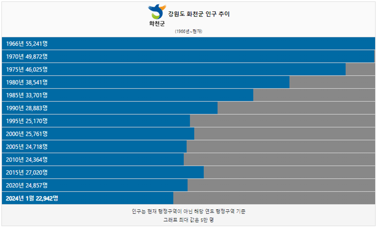 화천군 인구는 1966년 5만명 이었습니다. 이후 인구가 지속적으로 감소하였고 1990년 3만명 이하로 감소하였습니다. 2024년 현재 2만명이 화천군에 거주하고 있습니다.