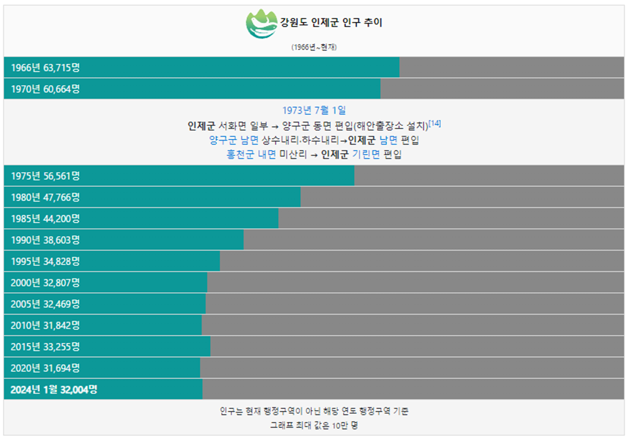 인제군 인구는 1966년 6만명 이었습니다. 이후 인구가 지속적으로 감소하였고 1990년 4만명 이하로 감소하였습니다. 2024년 현재 3만명이 인제군에 거주하고 있습니다.