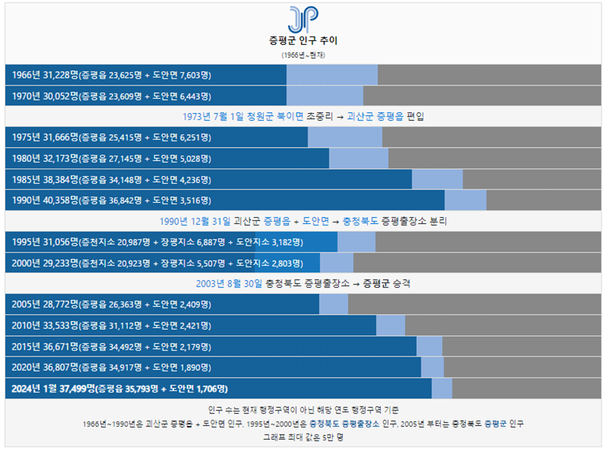 증평군 인구는 1922년 3만명 이었습니다. 이후 인구가 크게 증가하거나 감소하지 않았습니다. 2024년 현재 3만명이 증평군에 거주하고 있습니다.