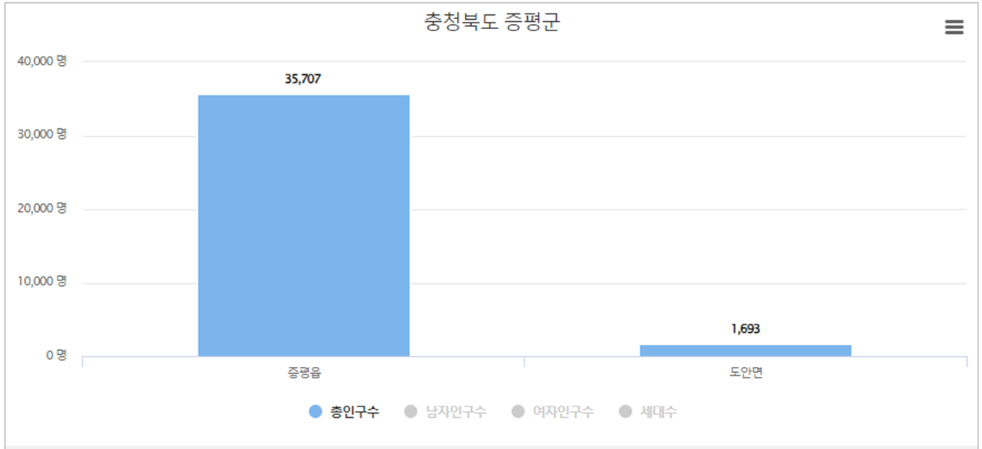 증평군에서 증평읍 인구가 가장 많으며 인구는 35,707 명, 세대수는 18,014 입니다. 두번째로는 도안면 인구가 많고 인구 1,693 명, 세대수는 956 입니다.