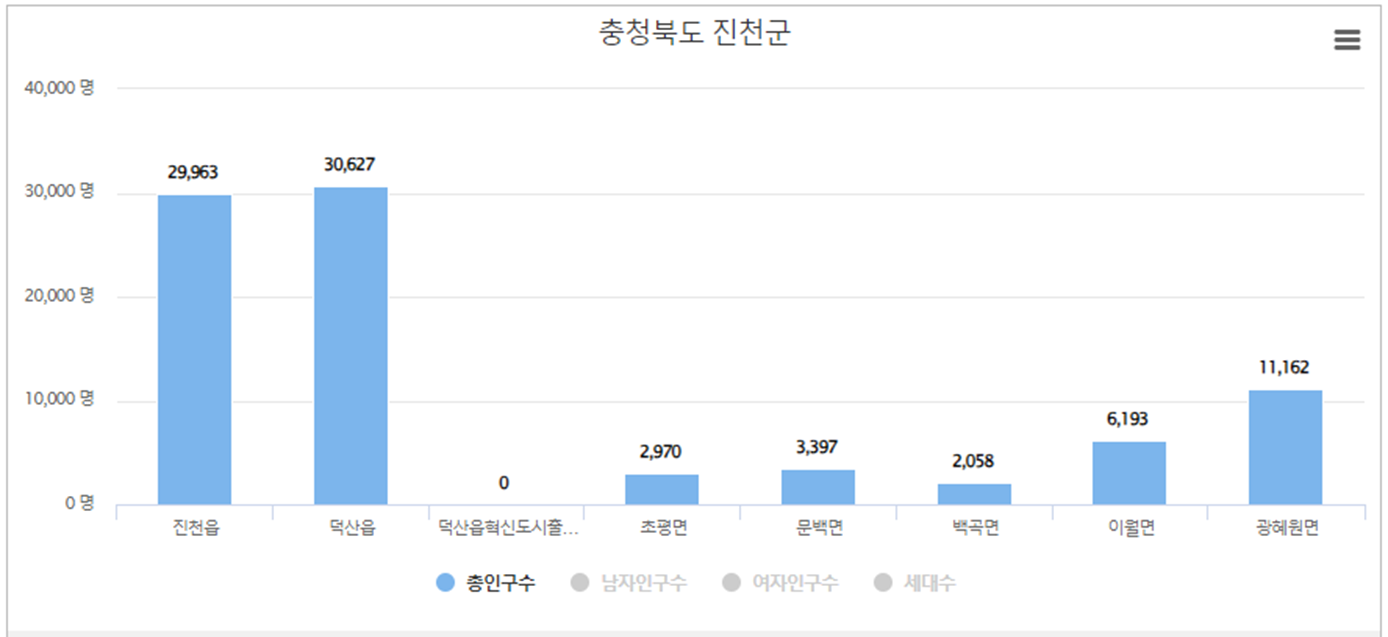 진천군에서 덕산읍 인구가 가장 많으며 인구는 30,627 명, 세대수는 13,568 입니다. 두번째로는 진천읍 인구가 많고 인구 29,963 명, 세대수는 14,796 입니다. 세번째는 광혜원면으로 인구는 11,162 명, 세대수는 6,080 입니다.