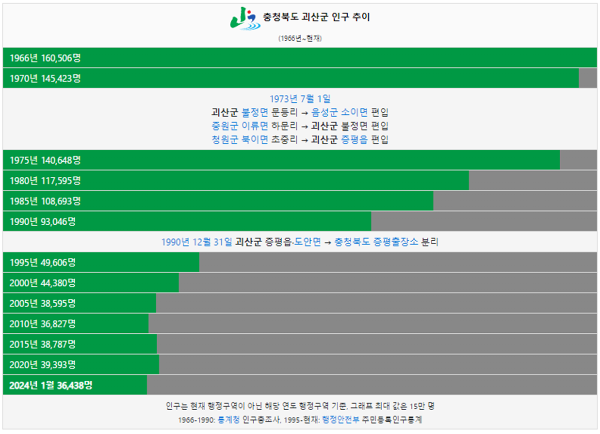 괴산군 인구는 1966년 16만명 이었습니다. 그리고 1990년 처음으로 10만명 이하로 감소하였고 이후에도 지속적으로 인구가 감소하였습니다. 2024년 현재 3만명이 괴산군에 거주하고 있습니다.