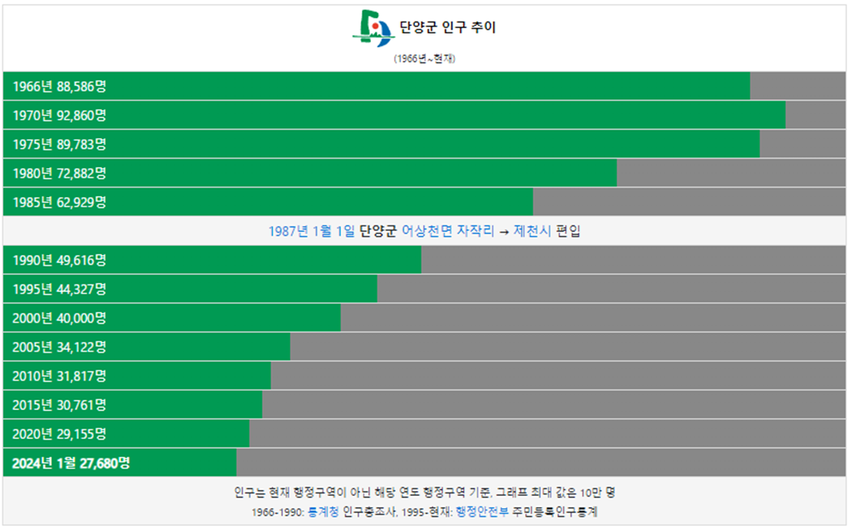 단양군 인구는 1966년 8만명 이었습니다. 그리고 1990년 처음으로 인구가 5만명 이하로 감소했고 이후 인구가 지속적으로 감소했습니다. 2024년 현재 2만명이 단양군에 거주하고 있습니다.