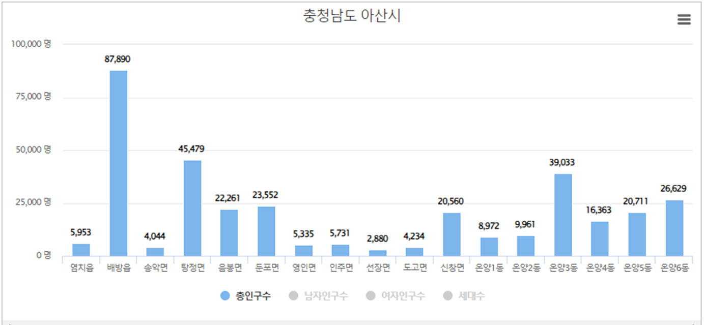 아산시에서 배방읍 인구가 가장 많으며 인구는 87,890 명, 세대수는 40,393 입니다. 두번째로는 탕정면 인구가 많고 인구 45,479 명, 세대수는 18,086 입니다. 세번째는 온양3동으로 인구는 39,033 명, 세대수는 16,108 입니다.