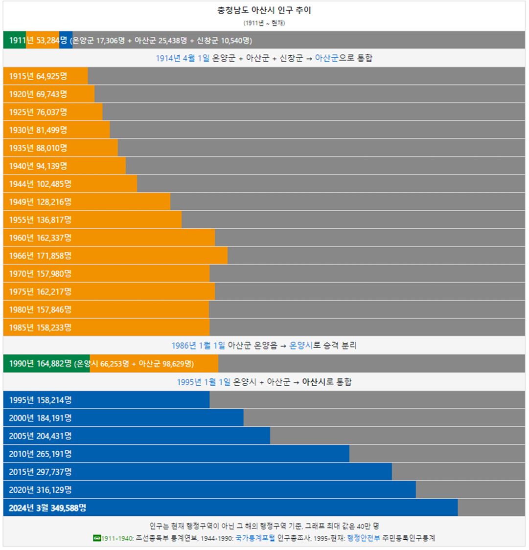 아산시 인구는 1966년 17만명 이었습니다. 그리고 2005년 처음으로 20만명을 돌파했고 이후에도 인구가 계속해서 증가했습니다. 2024년 현재 34만명이 아산시에 거주하고 있습니다.