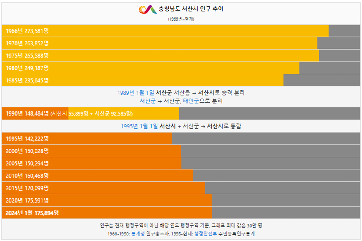 서산시 인구는 1966년 27만명 이었습니다. 그리고 1990년 서산군이 서산시로 승격 분리되면서 인구가 15만명 이하로 감소했지만 이후 꾸준히 인구가 증가했습니다. 2024년 현재 17만명이 서산시에 거주하고 있습니다.