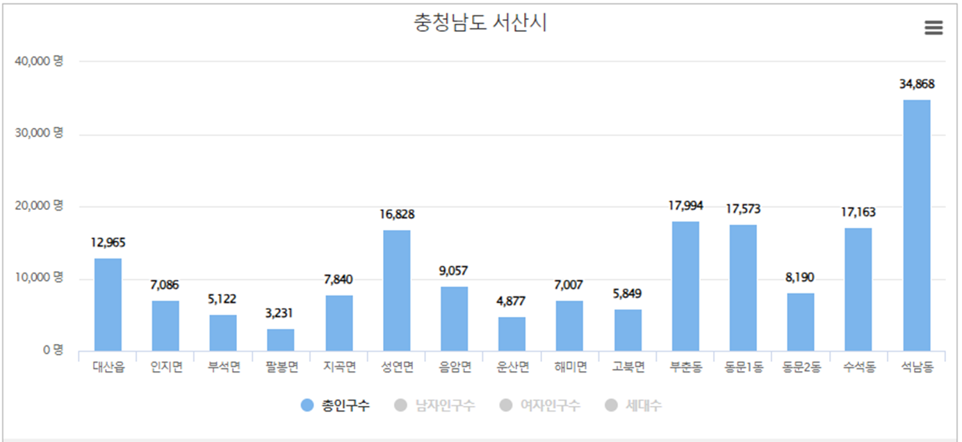 서산시에서 석남동 인구가 가장 많으며 인구는 34,868 명, 세대수는 14,770 입니다. 두번째로는 부춘동 인구가 많고 인구 17,994 명, 세대수는 8,879 입니다. 세번째는 동문1동으로 인구는 17,573 명, 세대수는 7,703 입니다.