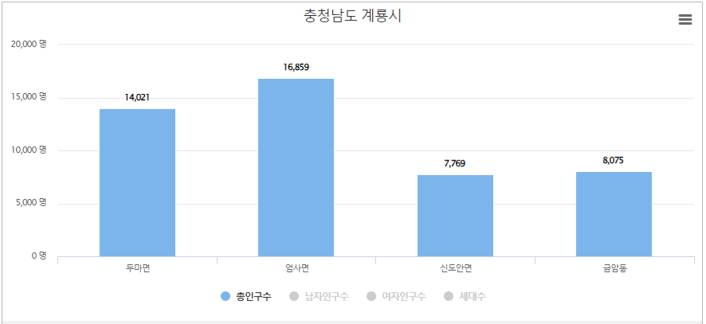 계룡시에서 엄사면 인구가 가장 많으며 인구는 16,859 명, 세대수는 7,740 입니다. 두번째로는 두마면 인구가 많고 인구 14,021 명, 세대수는 5,928 입니다. 세번째는 금암동으로 인구는 8,075 명, 세대수는 3,420 입니다.