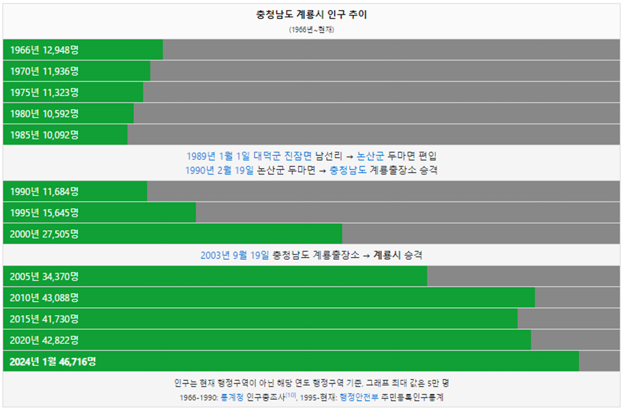 계룡시 인구는 1966년 1만명 이었습니다. 그리고 2000년 처음으로 2만명을 돌파했고 이후 인구가 꾸준히 증가하였습니다. 2024년 현재 4만명이 계룡시에 거주하고 있습니다.