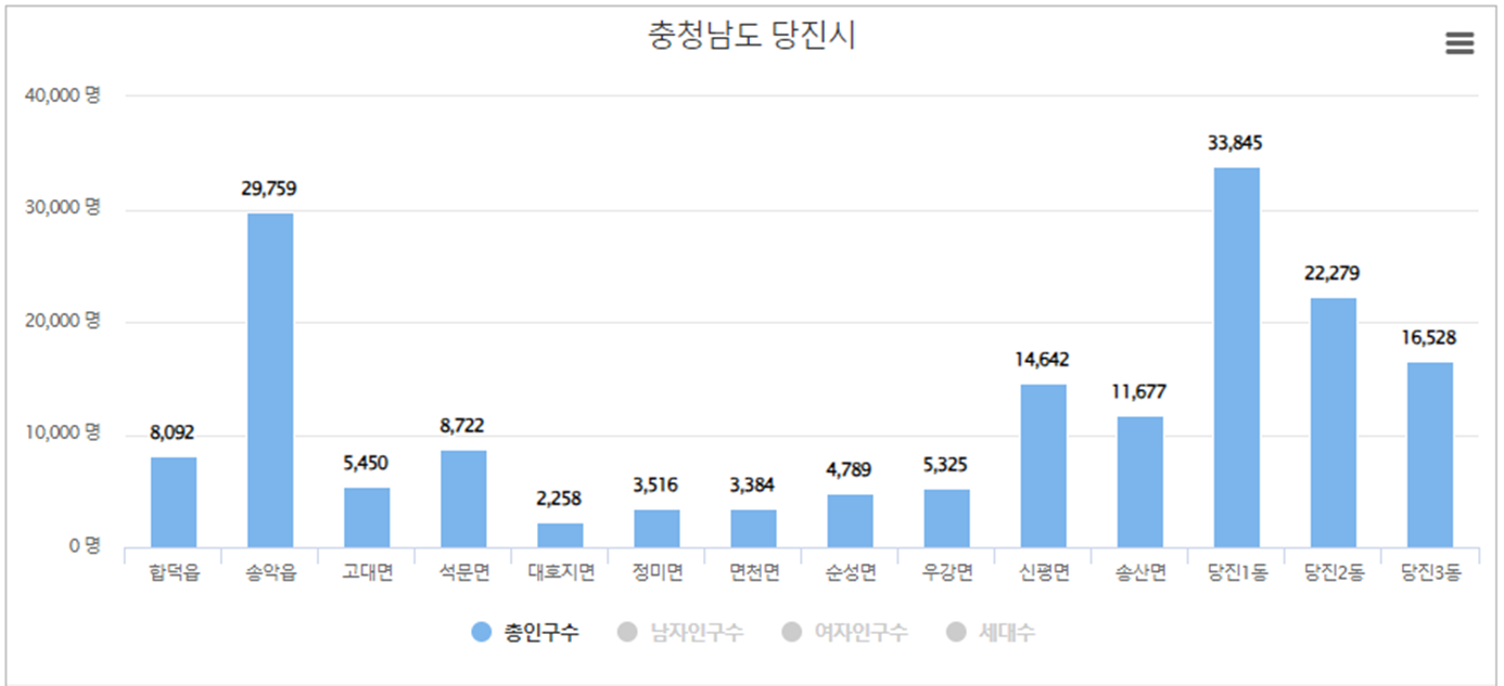 당진시에서 당진1동 인구가 가장 많으며 인구는 33,845 명, 세대수는 15,925 입니다. 두번째로는 송악읍 인구가 많고 인구 29,759 명, 세대수는 14,602 입니다. 세번째는 당진2동으로 인구는 22,279 명, 세대수는 9,572 입니다.