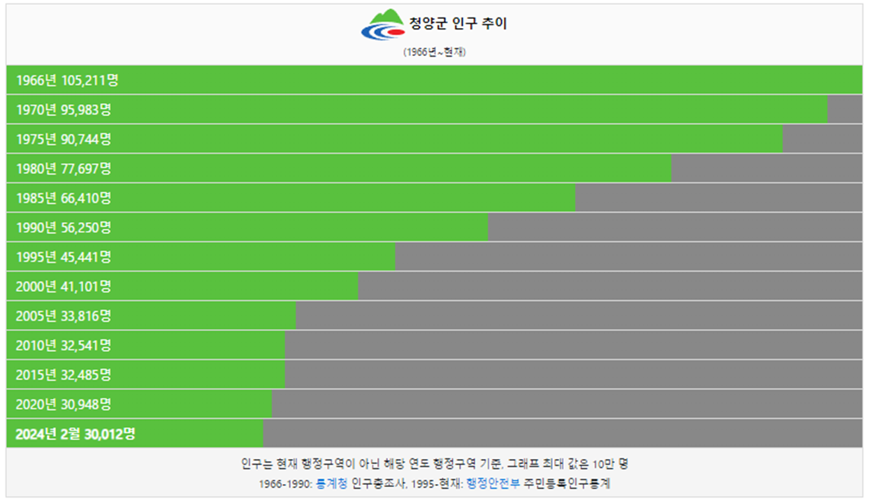 청양군 인구는 1966년 10만명 이었습니다. 그리고 1995년 처음으로 5만명 이하로 감소했고 이후로도 지속적으로 인구가 감소했습니다. 2024년 현재 3만명이 청양군에 거주하고 있습니다.