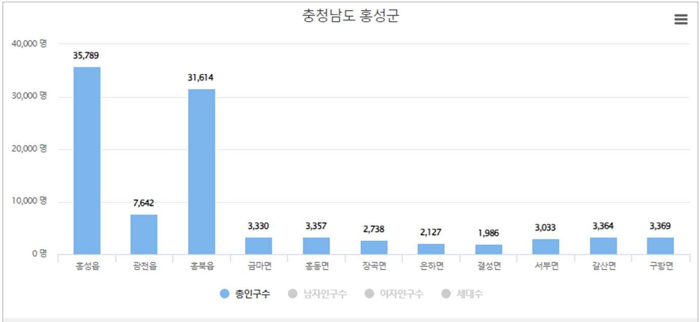 홍성군에서 홍성읍 인구가 가장 많으며 인구는 35,789 명, 세대수는 17,763 입니다. 두번째로는 홍북읍 인구가 많고 인구 31,614 명, 세대수는 13,313 입니다. 세번째는 광천읍으로 인구는 7,642 명, 세대수는 4,213 입니다.