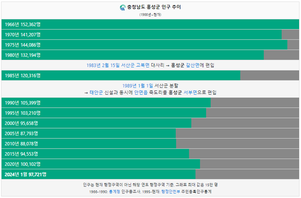 홍성군 인구는 1966년 17만명 이었습니다. 그리고 2005년 처음으로 10만명 이하로 감소했고 이후로도 인구가 꾸준히 감소하고 있습니다. 2024년 현재 9만명이 홍성군에 거주하고 있습니다.