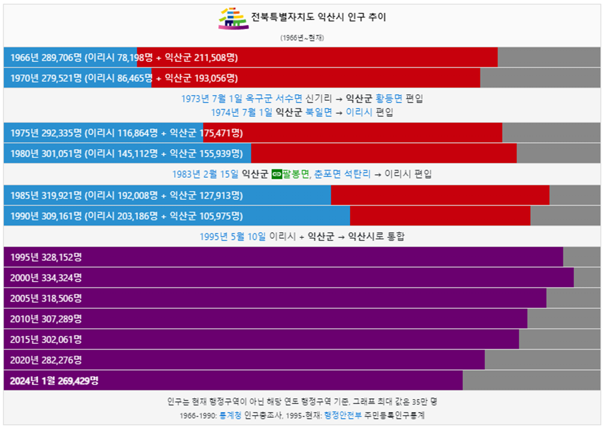 익산시(이리시+익산군) 인구는 1966년 28만명 이었습니다. 그리고 2000년 33만명으로 가장 많은 인구가 거주했고 이후 인구가 꾸준히 감소했습니다. 2024년 현재 26만명이 익산시에 거주하고 있습니다.