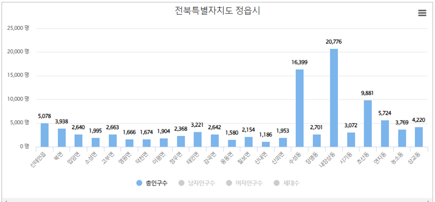 정읍시에서 내장상동 인구가 가장 많으며 인구는 20,776 명, 세대수는 9,136 입니다. 두번째로는 수성동 인구가 많고 인구 16,399 명, 세대수는 8,534 입니다. 세번째는 초산동으로 인구는 9,881 명, 세대수는 4,241 입니다.
