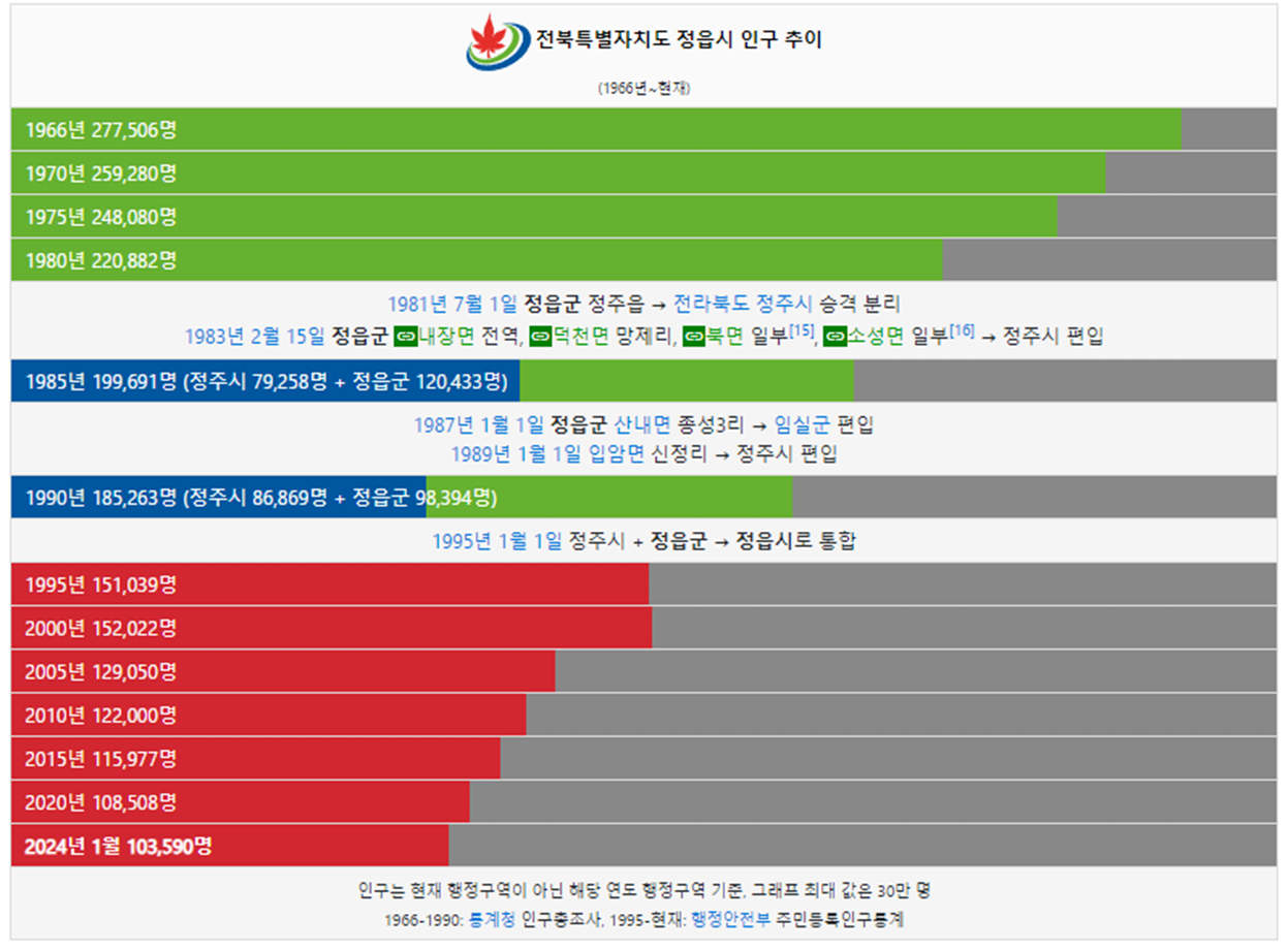 정읍시 인구는 1966년 27만명 이었습니다. 그리고 1995년 처음으로 15만명 이하로 감소했고 이후에도 인구가 꾸준히 감소했습니다. 2024년 현재 10만명이 정읍시에 거주하고 있습니다.