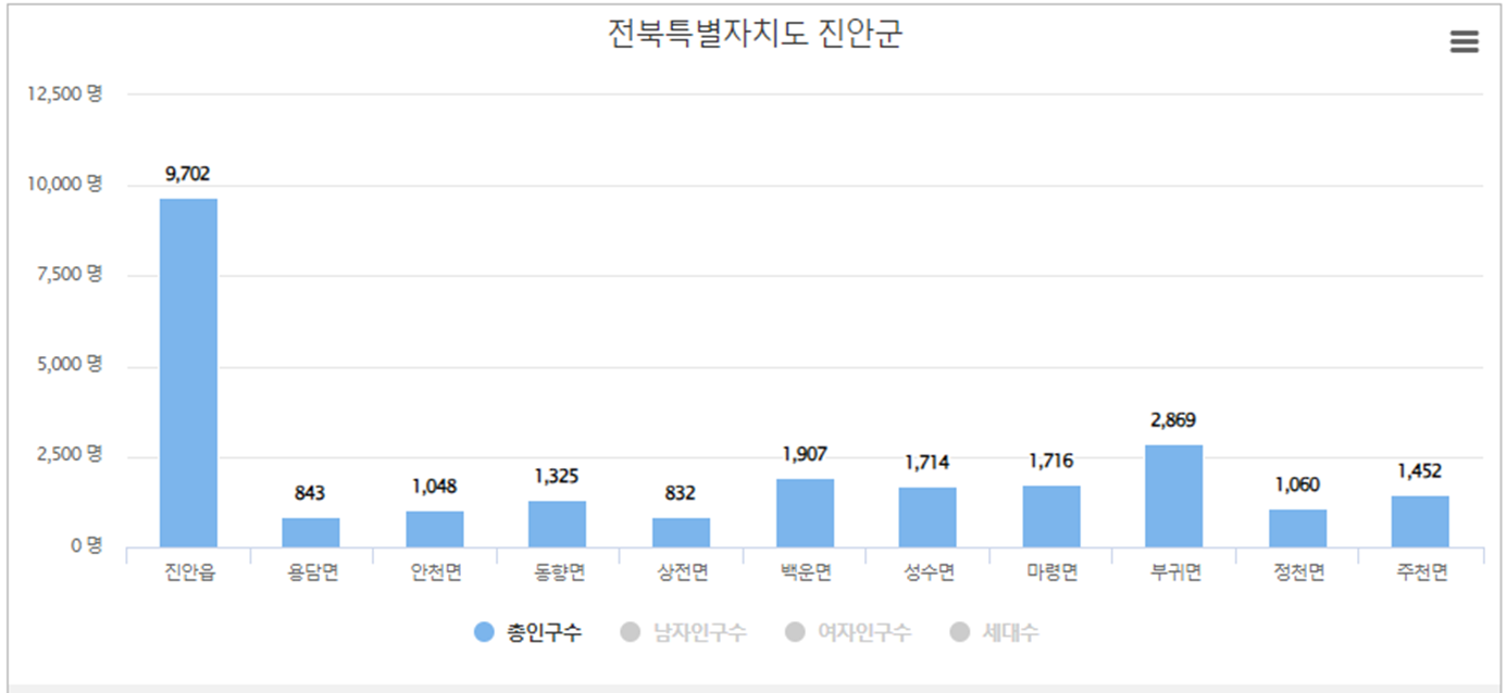 진안군에서 진안읍 인구가 가장 많으며 인구는 9,702 명, 세대수는 5,030 입니다. 두번째로는 부귀면 인구가 많고 인구 2,869 명, 세대수는 1,544 입니다. 세번째는 백운면으로 인구는 1,907 명, 세대수는 1,175 입니다.