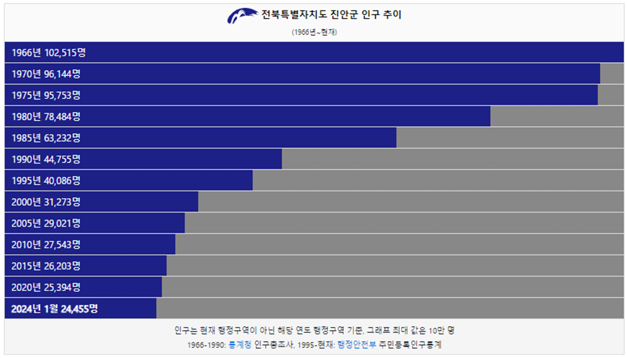 진안군 인구는 1966년 10만명 이었습니다. 그리고 1990년 처음으로 5만명 이하로 감소했고 이후로도 꾸준히 인구가 감소했습니다. 2024년 현재 2만명이 진안군에 거주하고 있습니다.