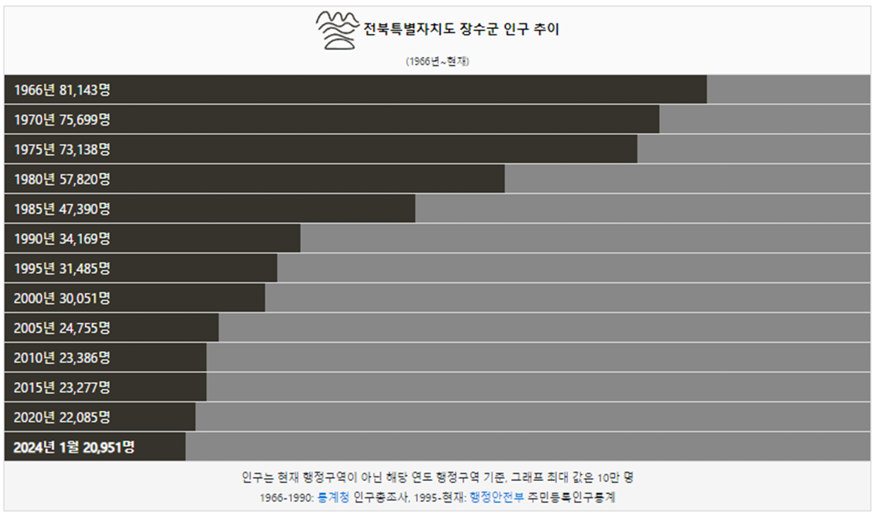 장수군 인구는 1966년 6만명 이었습니다. 그리고 1985년 처음으로 5만명 이하로 인구가 감소했고 이후로도 꾸준히 인구가 감소했습니다. 2024년 현재 2만명이 장수군에 거주하고 있습니다.