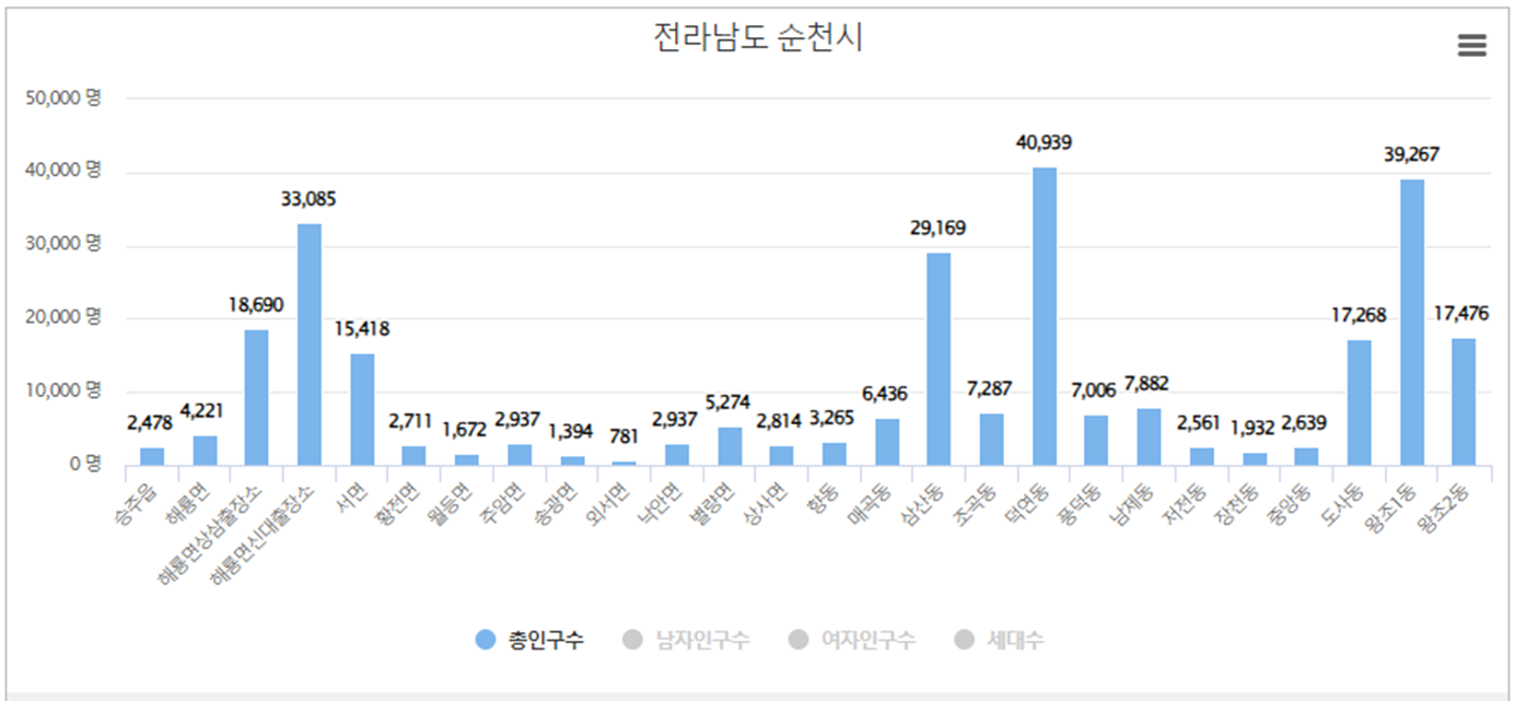 순천시에서 덕연동 인구가 가장 많으며 인구는 40,939 명, 세대수는 17,674 입니다. 두번째로는 왕조1동 인구가 많고 인구 39,267 명, 세대수는 17,616 입니다. 세번째는 해룡면신대출장소로 인구는 33,085 명, 세대수는 11,673 입니다.