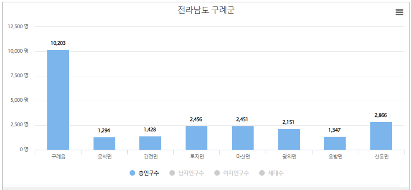 구례군에서 구례읍 인구가 가장 많으며 인구는 10,203 명, 세대수는 5,255 입니다. 두번째로는 산동면 인구가 많고 인구 2,866 명, 세대수는 1,660 입니다. 세번째는 마산면으로 인구는 2,456 명, 세대수는 1,472 입니다.