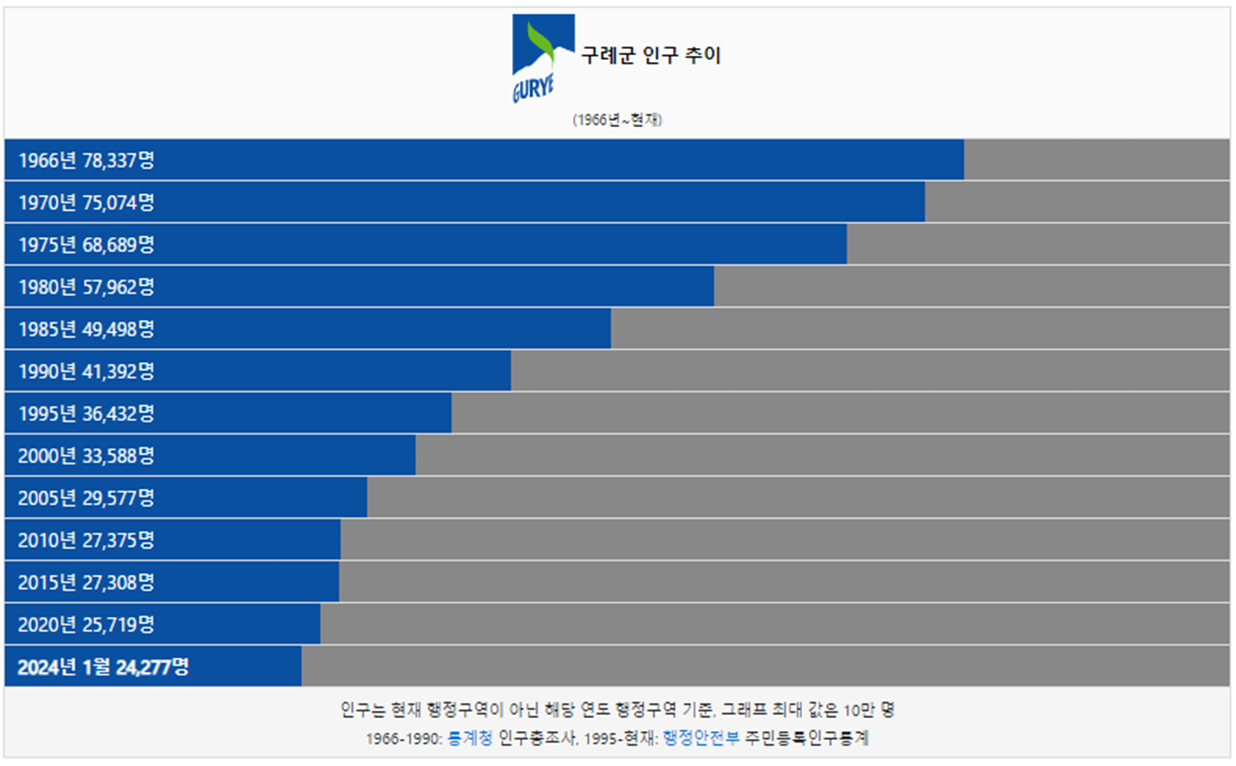 구례군 인구는 1966년 7만명 이었습니다. 그리고 1985년 인구가 처음으로 5만명 이하로 감소했고 이후 인구가 계속해서 감소했습니다. 2024년 현재 2만명이 구례군에 거주하고 있습니다.