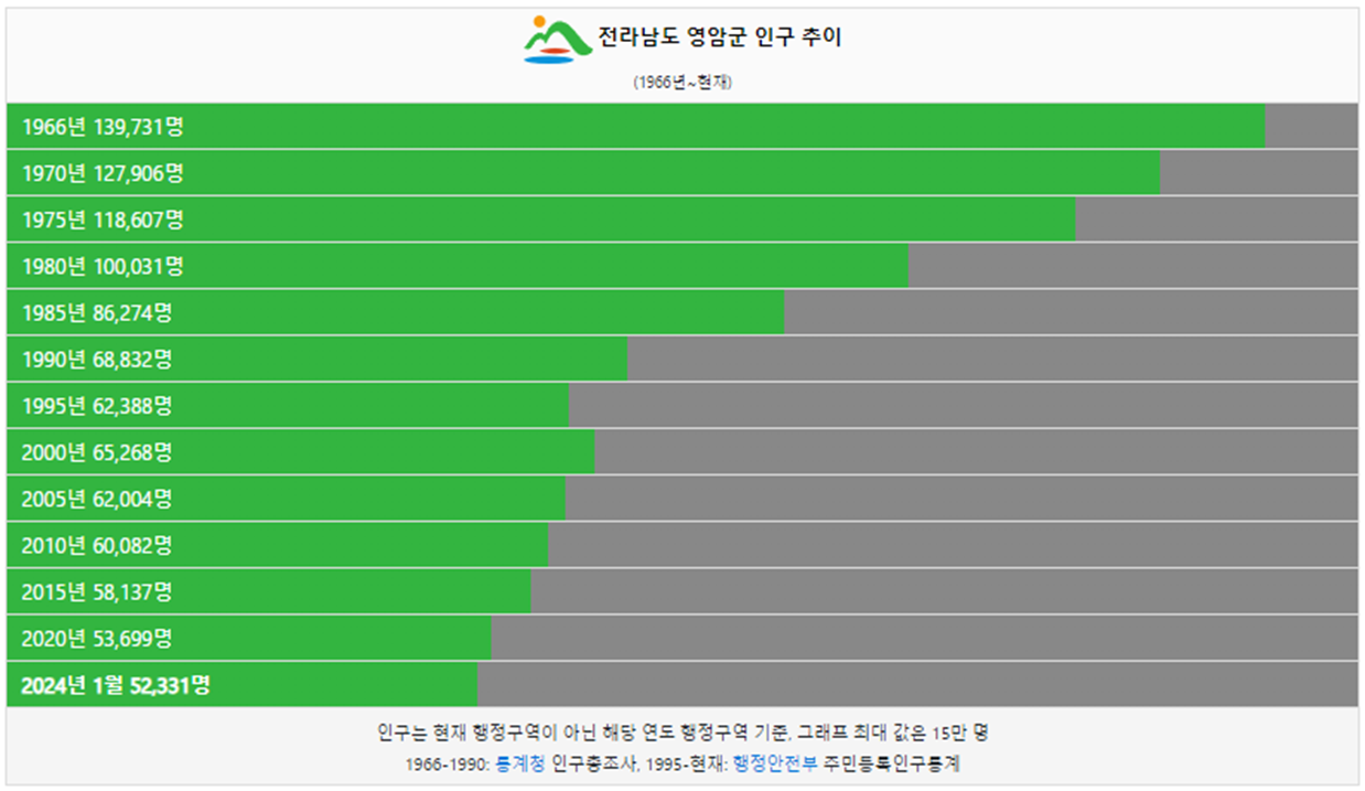 영암군 인구는 1966년 13만명 이었습니다. 그리고 1985년 인구가 처음으로 10만명 이하로 감소했고 이후 인구가 계속해서 감소했습니다. 2024년 현재 5만명이 영암군에 거주하고 있습니다.