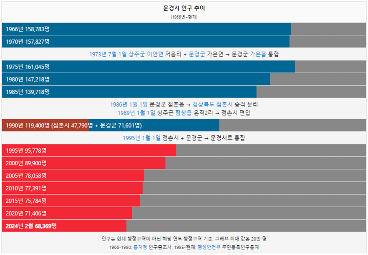 문경시 인구는 1966년 15만명 이었습니다. 그리고 1995년 인구가 처음으로 10만명 이하로 감소했고 이후 인구가 계속해서 감소했습니다. 2024년 현재 6만명이 문경시에 거주하고 있습니다.