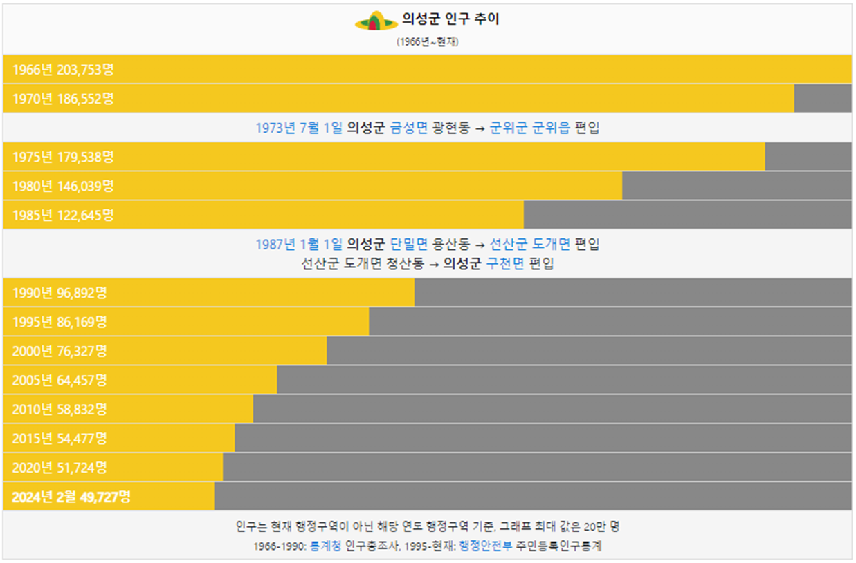 의성군 인구는 1966년 20만명 이었습니다. 그리고 1990년 인구가 처음으로 10만명 이하로 감소했고 이후 인구가 계속해서 감소했습니다. 2024년 현재 4만명이 의성군에 거주하고 있습니다.