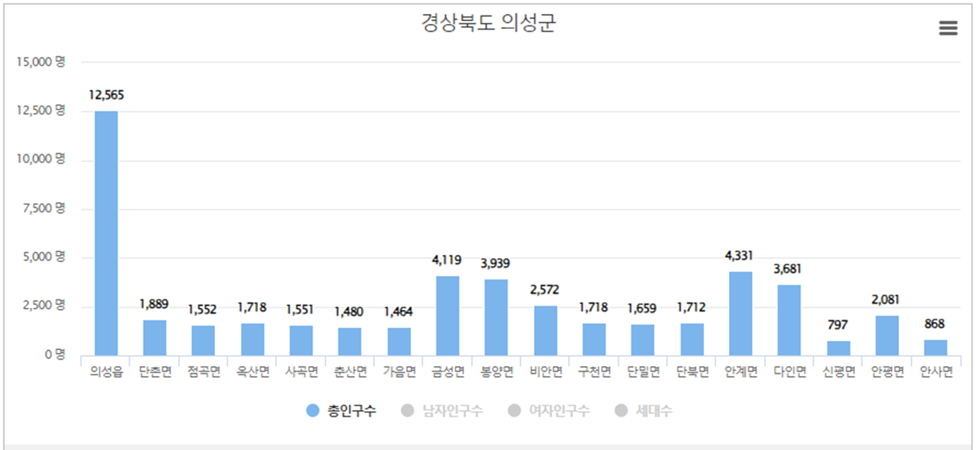 의성군에서 의성읍 인구가 가장 많으며 인구는 12,565 명, 세대수는 6,746 입니다. 두번째로는 안계면 인구가 많고 인구 4,331 명, 세대수는 2,491 입니다. 세번째는 금성면으로 인구는 4,119 명, 세대수는 2,537 입니다.