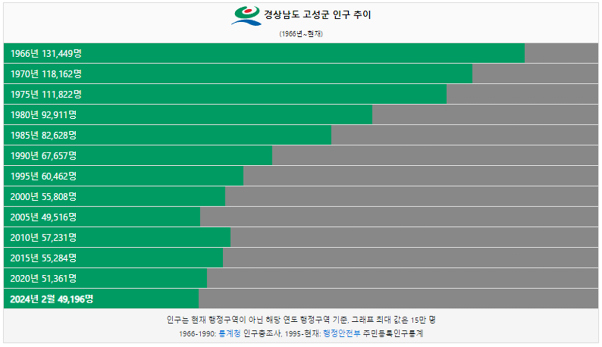 고성군 인구는 1966년에 13만명으로 가장 많았습니다. 그 이후 지속적으로 하락하였으며 1980년 처음으로 10만명 이하로 인구가 줄었습니다. 2024년 현재 4만 명이 고성군에 거주하고 있습니다.