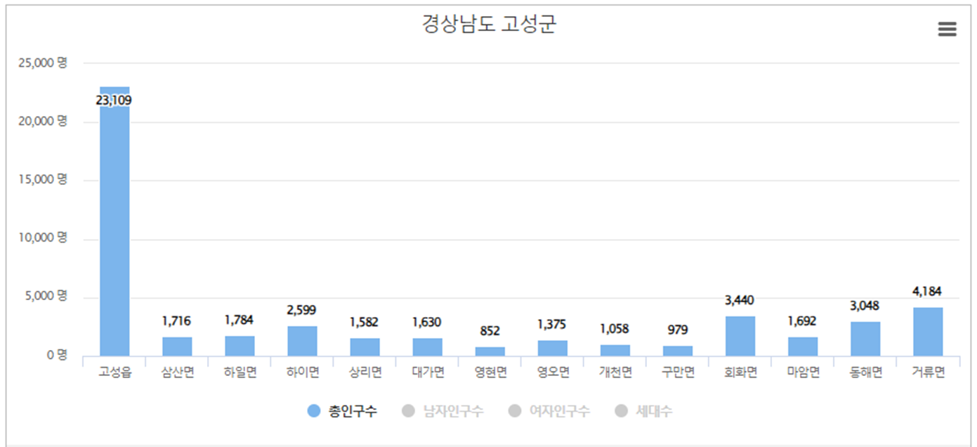 고성군에서 고성읍이 인구가 가장 많으며 인구는 23,109 명, 세대수는 11,266 입니다. 두번째로는 거류면 인구가 많고 인구 4,184 명, 세대수는 2,421 입니다. 세번째는 회화면으로 인구는 3,440 명, 세대수는 1,919 입니다.