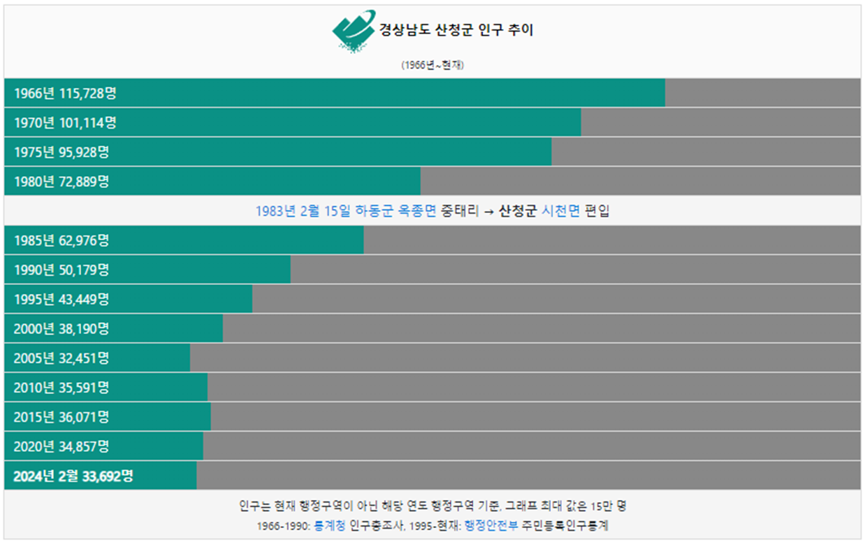 산청군 인구는 1966년 11만 5728명으로 가장 많았습니다. 그 이후 지속적으로 하락하였으며 1975년 처음으로 10만명 이하로 인구가 줄었습니다. 2024년 현재 3만 명이 산청군에 거주하고 있습니다.