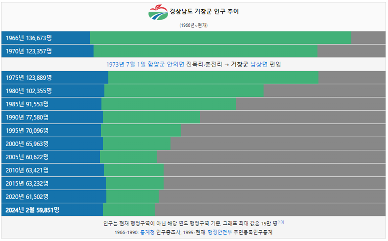 거창군 인구는 1966년 13만 6673명으로 가장 인구가 많았고, 이후 도시에 인구가 집중되면서 지속적으로 인구가 감소했습니다. 1985년 9만 1528명으로 처음으로 10만명 이하로 줄었으며, 2024년 현재 5만 명이 거창군에 거주하고 있습니다.