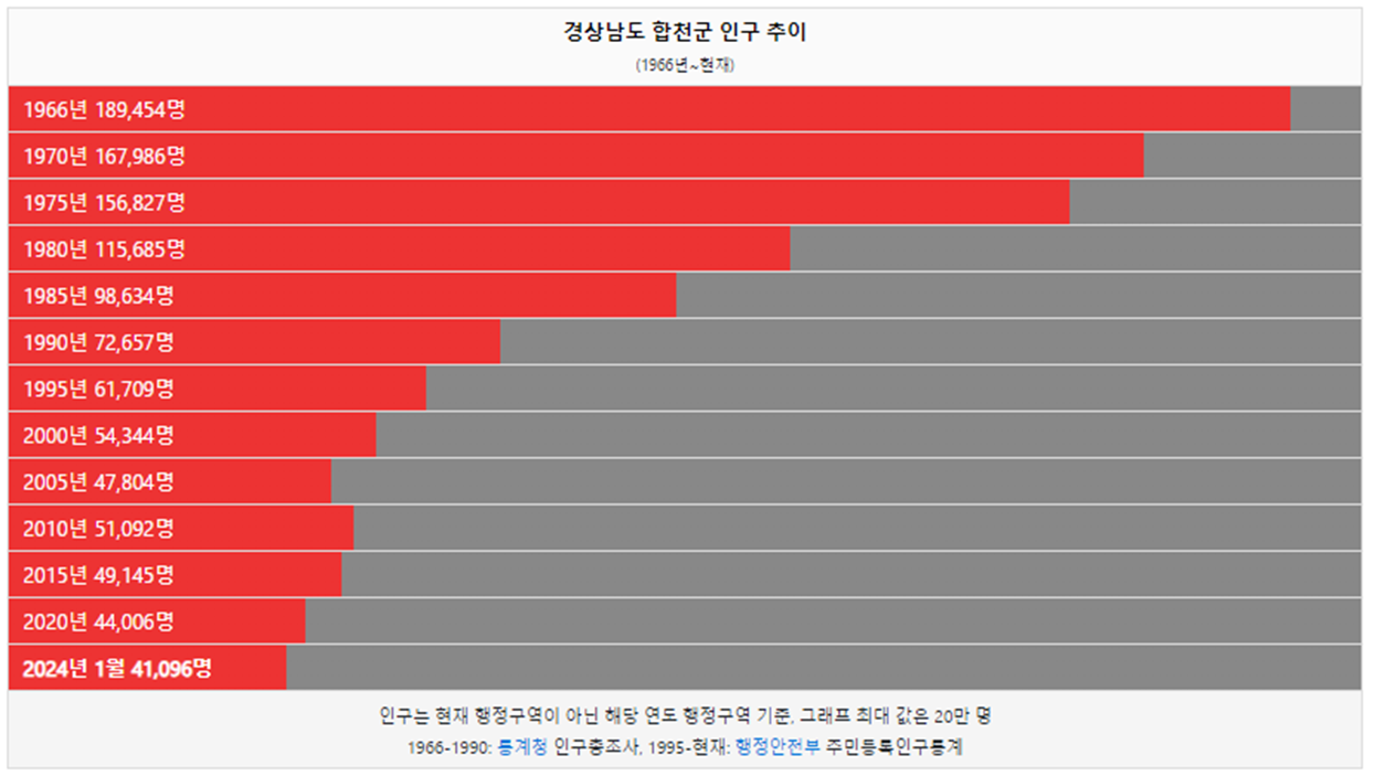 1966년 합천군 인구는 18만 9454명으로 가장 많았고, 이후 점차적으로 인구가 감소했습니다. 1985년에는 처음으로 10만명 이하로 떨어졌고 2024년 현재는 4만 명입니다. 지방인구 감소로 인해서 앞으로도 인구수가 하락할 것으로 예상됩니다.