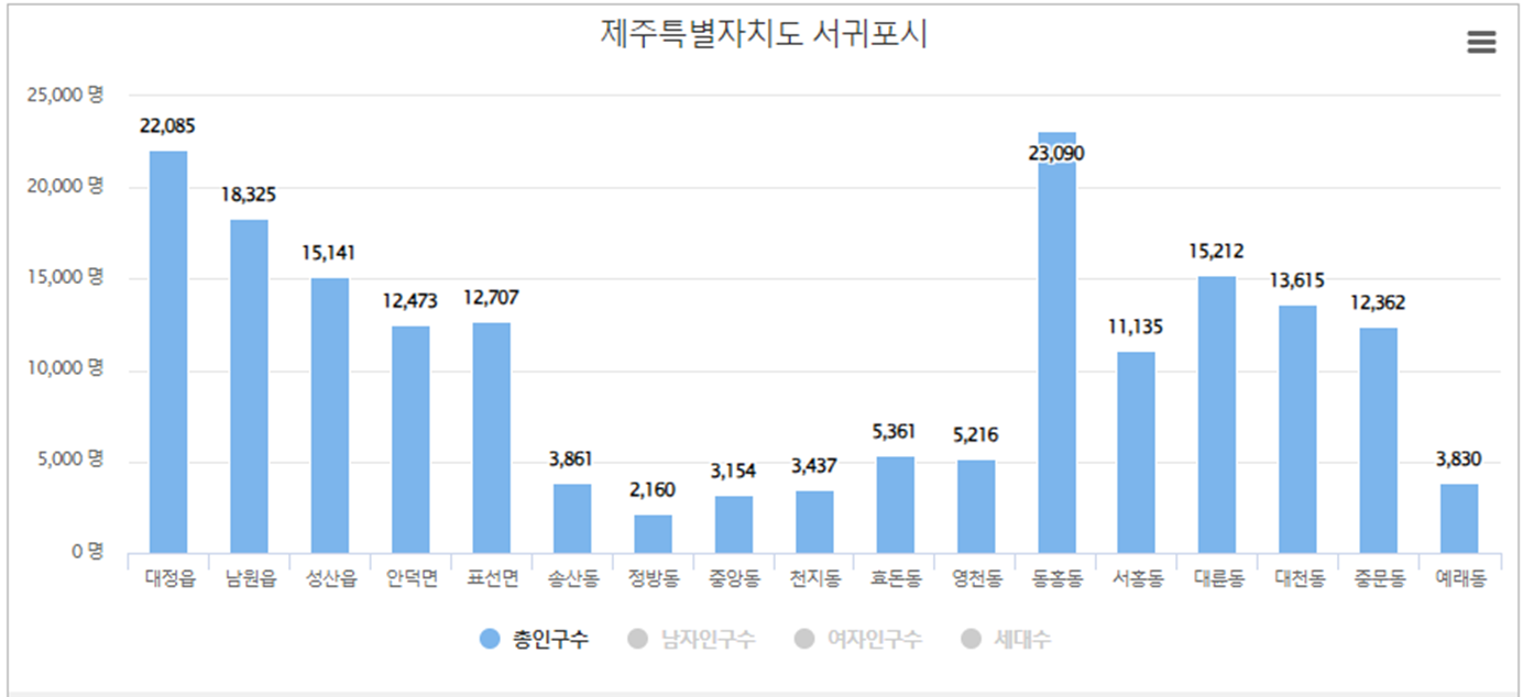 서귀포시에서 동홍동이 인구가 가장 많으며 인구는 23,090 명, 세대수는 9,962 입니다. 두번째로는 대정읍 인구가 많고 인구 22,085 명, 세대수는 10,806 입니다. 세번째는 남원읍으로 인구는 18,325 명, 세대수는 8,876 입니다.