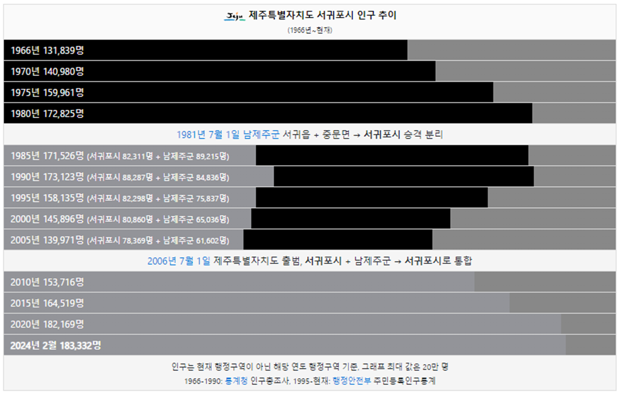 서귀포시 인구는 1966년에 131,839명으로 15만명이 안됐지만 약 10년 후인 1975년에 15만명을 돌파했고 현재 183,332명으로 거의 20만명에 육박하고 있습니다.