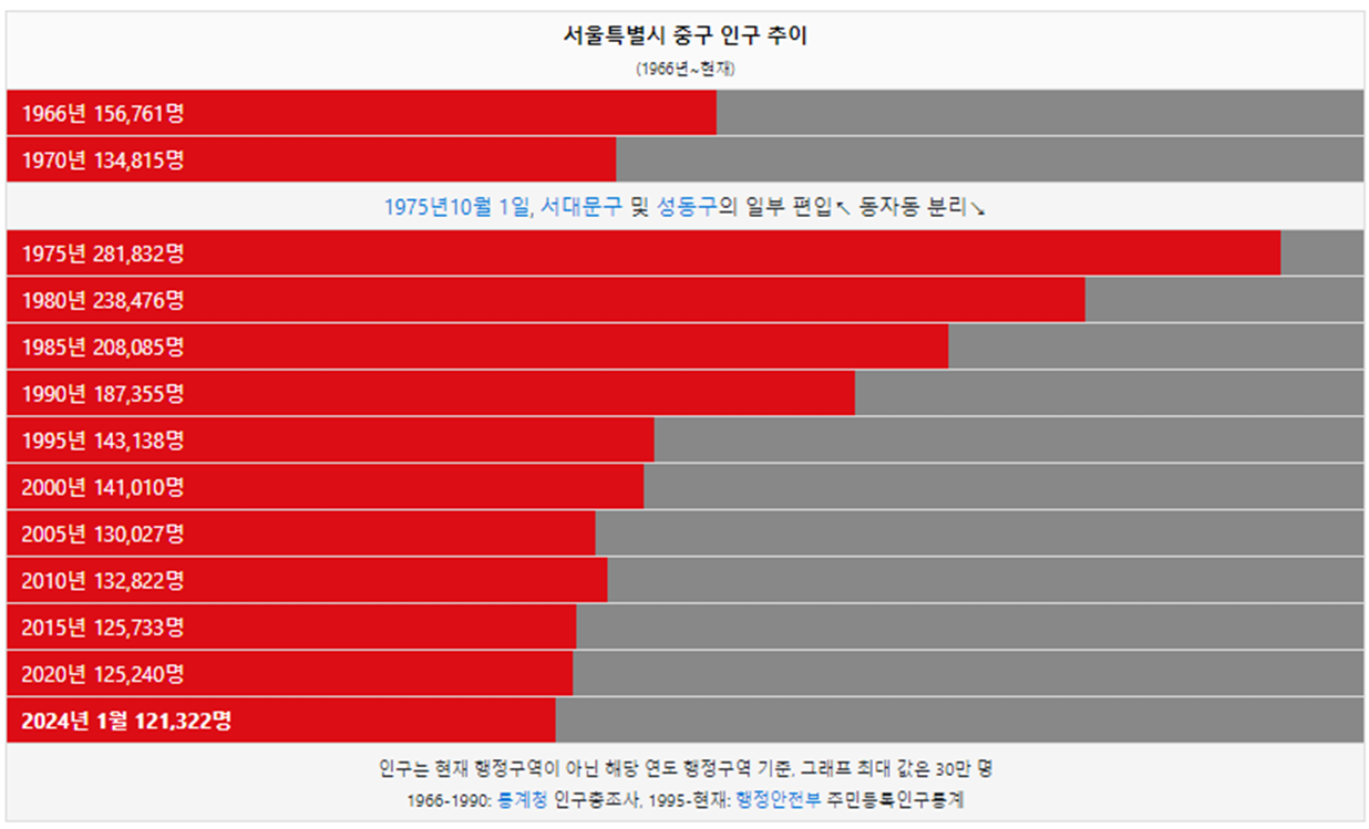 중구 인구는 1966년 15만명 이었습니다. 그리고 1975년 인구가 처음으로 25만명 이상이 됐고 이후 인구가 꾸준히 감소했습니다. 2024년 현재 12만명이 중구에 거주하고 있습니다.