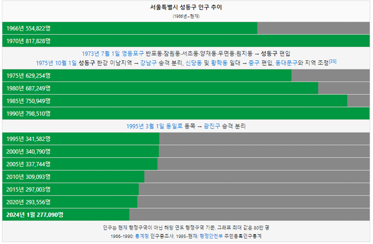성동구 인구는 1966년 55만명 이었습니다. 그리고 1990년 인구가 처음으로 79만명 이상이 됐고 이후 동일로 동쪽이 광진구로 승격 분리되면서 인구가 줄었습니다. 2024년 현재 27만명이 성동구에 거주하고 있습니다.