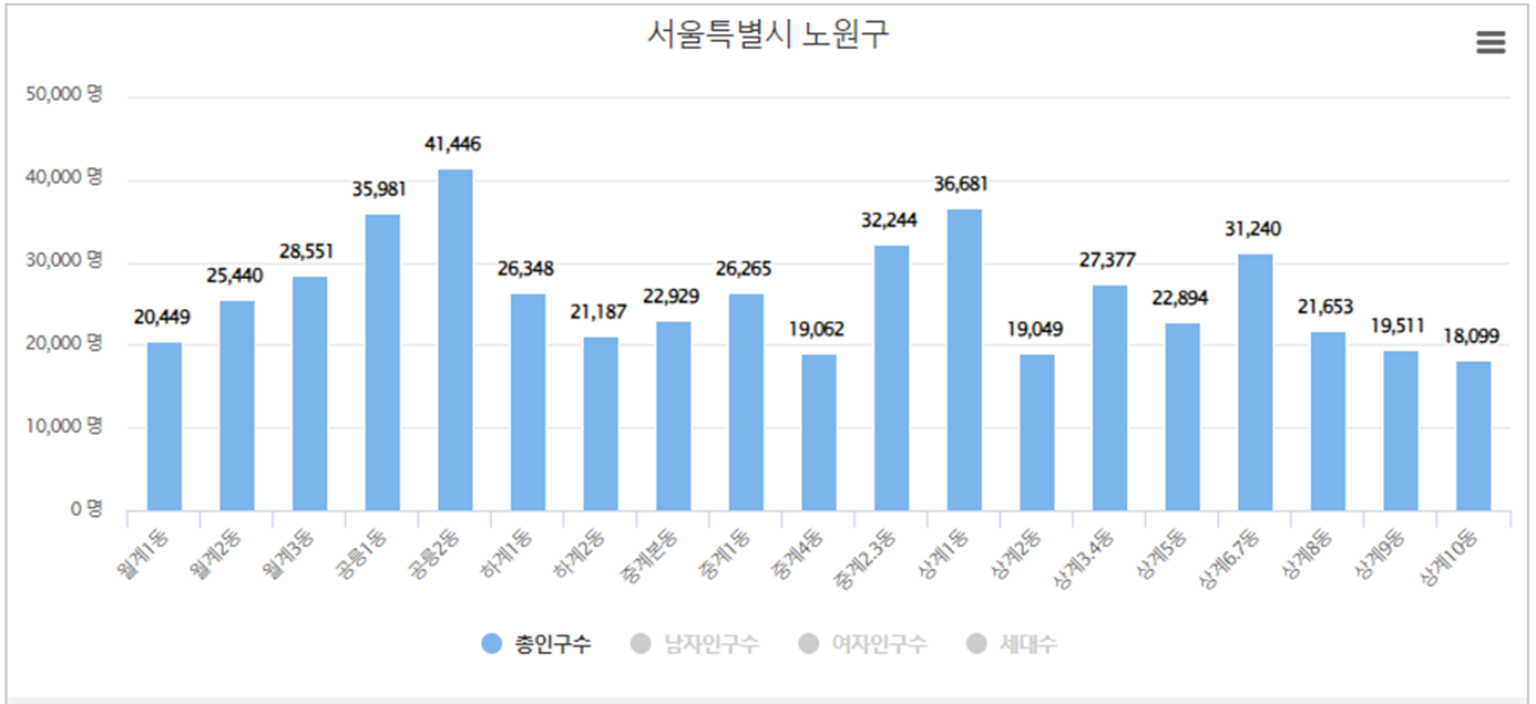 노원구에서 공릉2동이 인구가 가장 많으며 인구는 41,446 명, 세대수는 17,928 입니다. 두번째로는 상계1동 인구가 많고 인구 36,681 명, 세대수는 15,543 입니다. 세번째는 공릉1동으로 인구는 35,981 명, 세대수는 18,688 입니다.