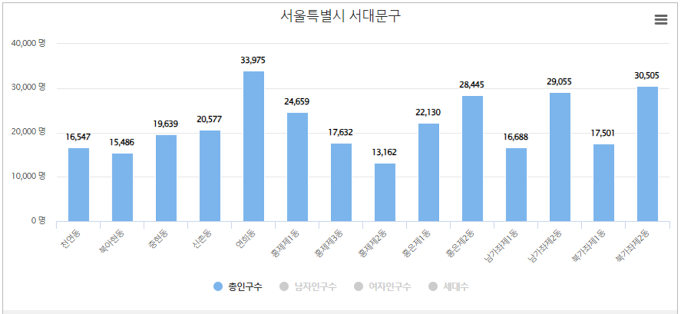 서대문구에서 연희동이 인구가 가장 많으며 인구는 33,975 명, 세대수는 18,763 입니다. 두번째로는 북가좌제2동 인구가 많고 인구 30,505 명, 세대수는 14,581 입니다. 세번째는 남가좌제2동으로 인구는 29,055 명, 세대수는 13,429 입니다.