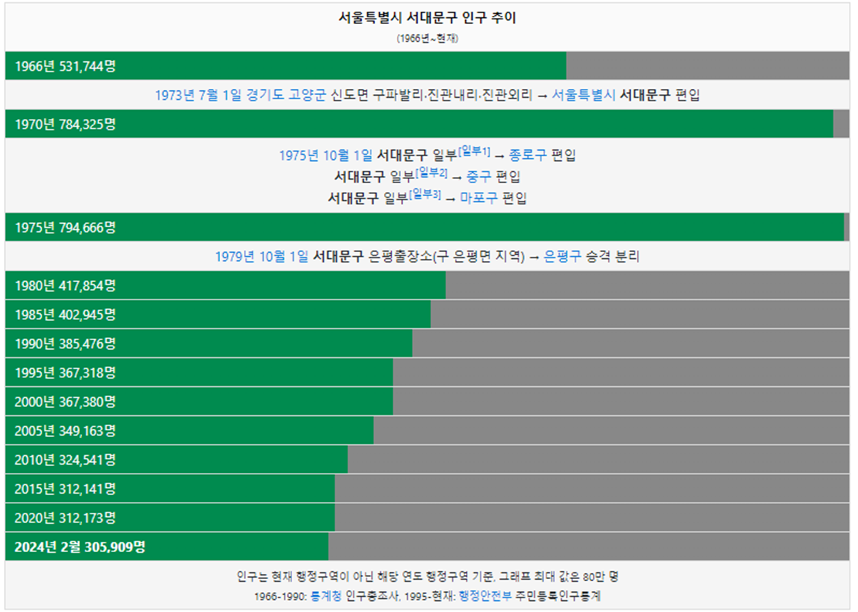 서대문구 인구는 1966년 53만명 이었습니다. 그리고 1975년 인구 79만명 이상이 됐고 이후 서대문구 은평출장소가 은평구로 승격 분리되었습니다. 이후 인구가 꾸준히 감소하였고 2024년 현재 30만명이 서대문구에 거주하고 있습니다.