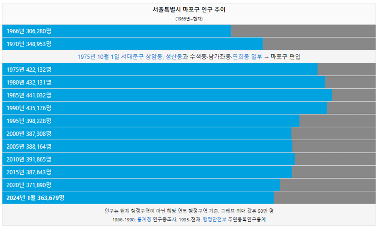 마포구 인구는 1966년 30만명 이었습니다. 그리고 1985년 인구 44만명 이상이 됐고 이후 인구가 꾸준히 감소했습니다. 2024년 현재 36만명이 마포구에 거주하고 있습니다.