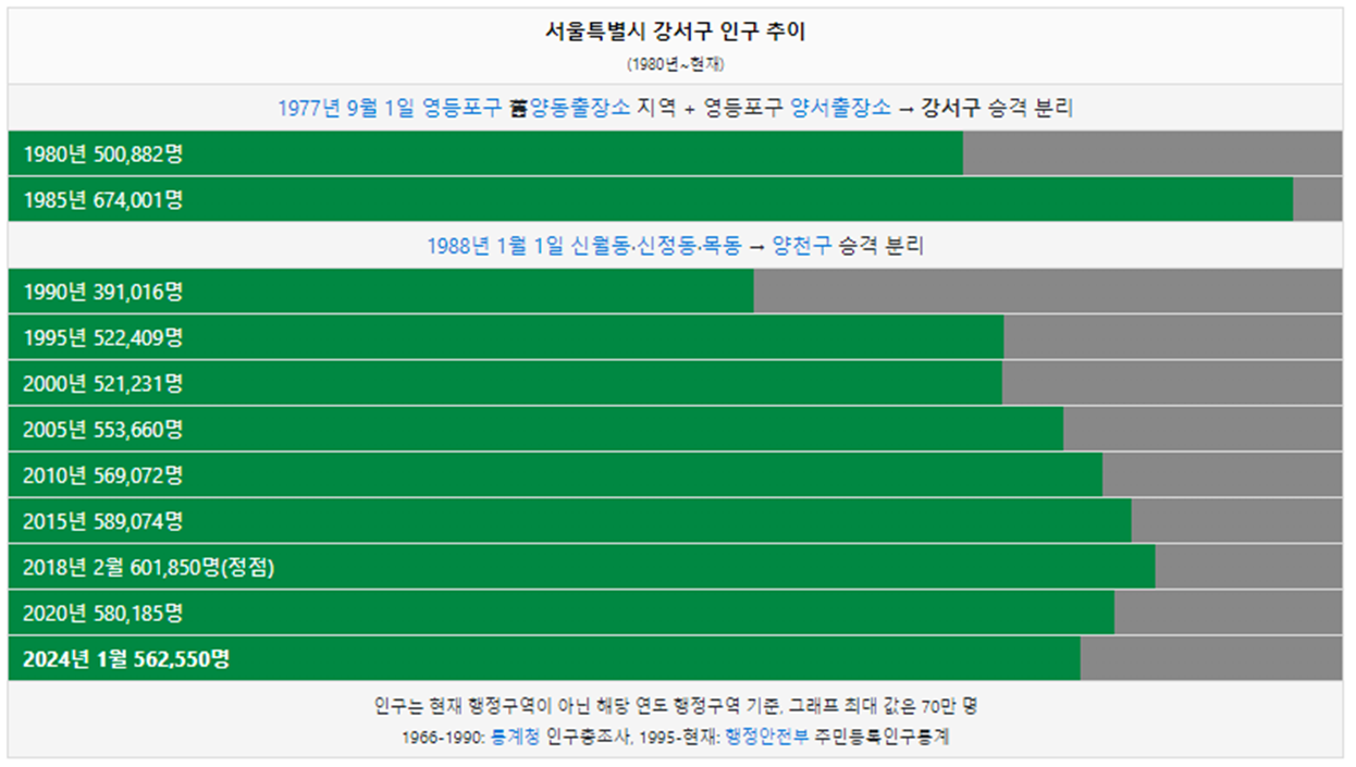 강서구 인구는 1980년 50만명 이었습니다. 그리고 1985년 인구 65만명으로 가장 많은 인구가 거주했고 이후 신월동, 신정동, 목동이 양천구로 승격 분리되면서 인구가 줄었습니다. 2024년 현재 56만명이 강서구에 거주하고 있습니다.