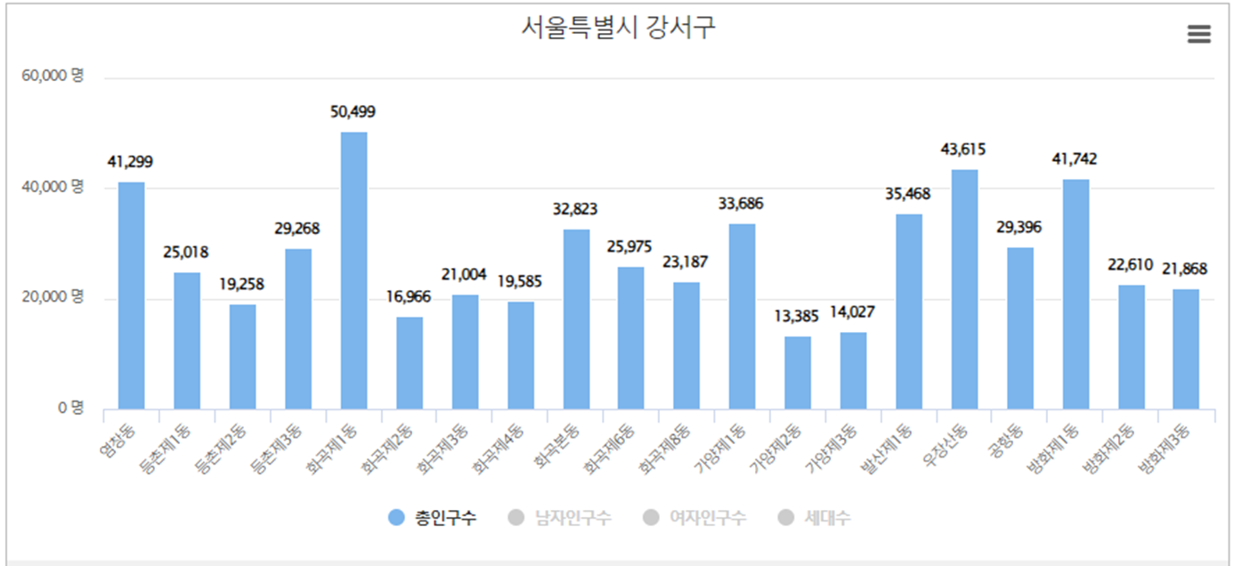강서구에서 화곡제1동이 인구가 가장 많으며 인구는 50,499 명, 세대수는 28,092 입니다. 두번째로는 우장산동 인구가 많고 인구 43,615 명, 세대수는 16,805 입니다. 세번째는 방화제1동으로 인구는 41,742 명, 세대수는 17,215 입니다.